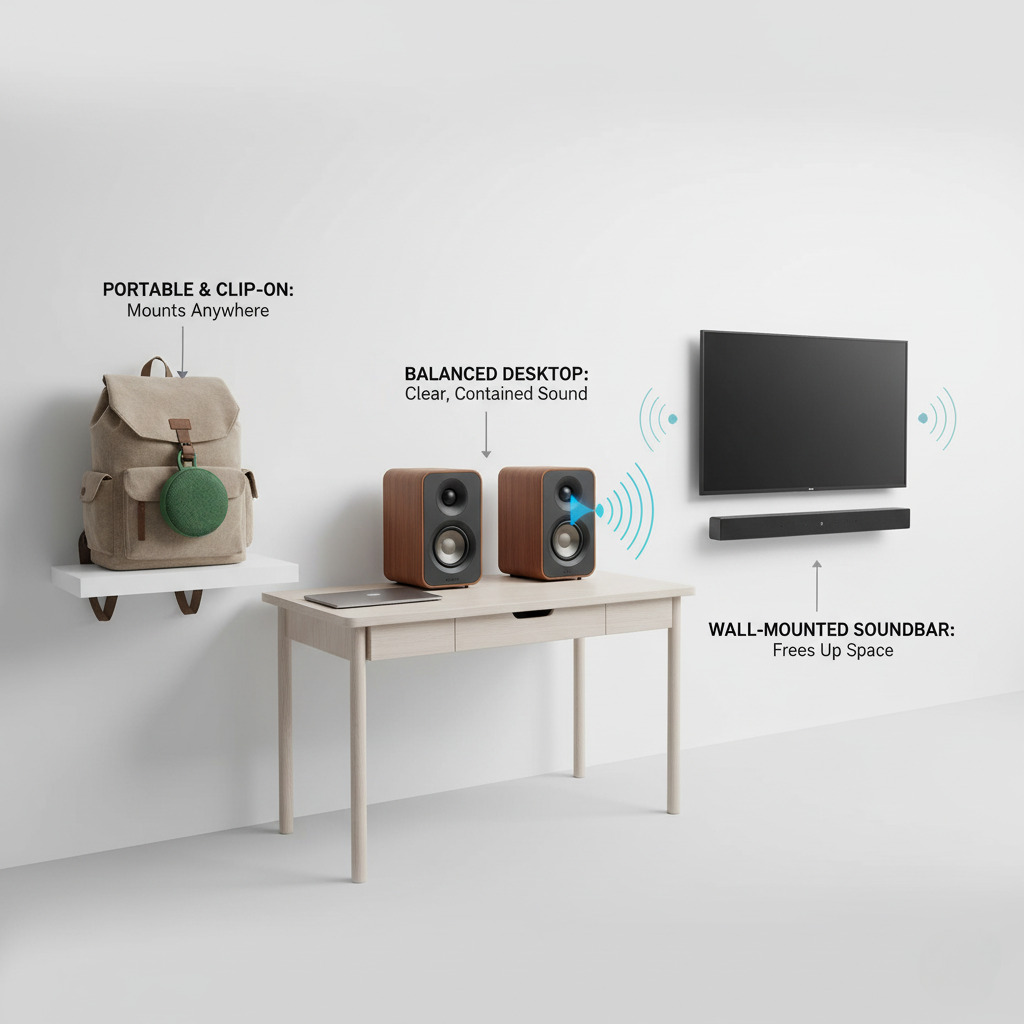 | Dimensions | ≤6 inches tall, wall-mountable (e.g., JBL Clip 5 at 3.4×5.3 inches) | Frees desks or shelves; clips/mounts adapt to vertical living without clutter. |