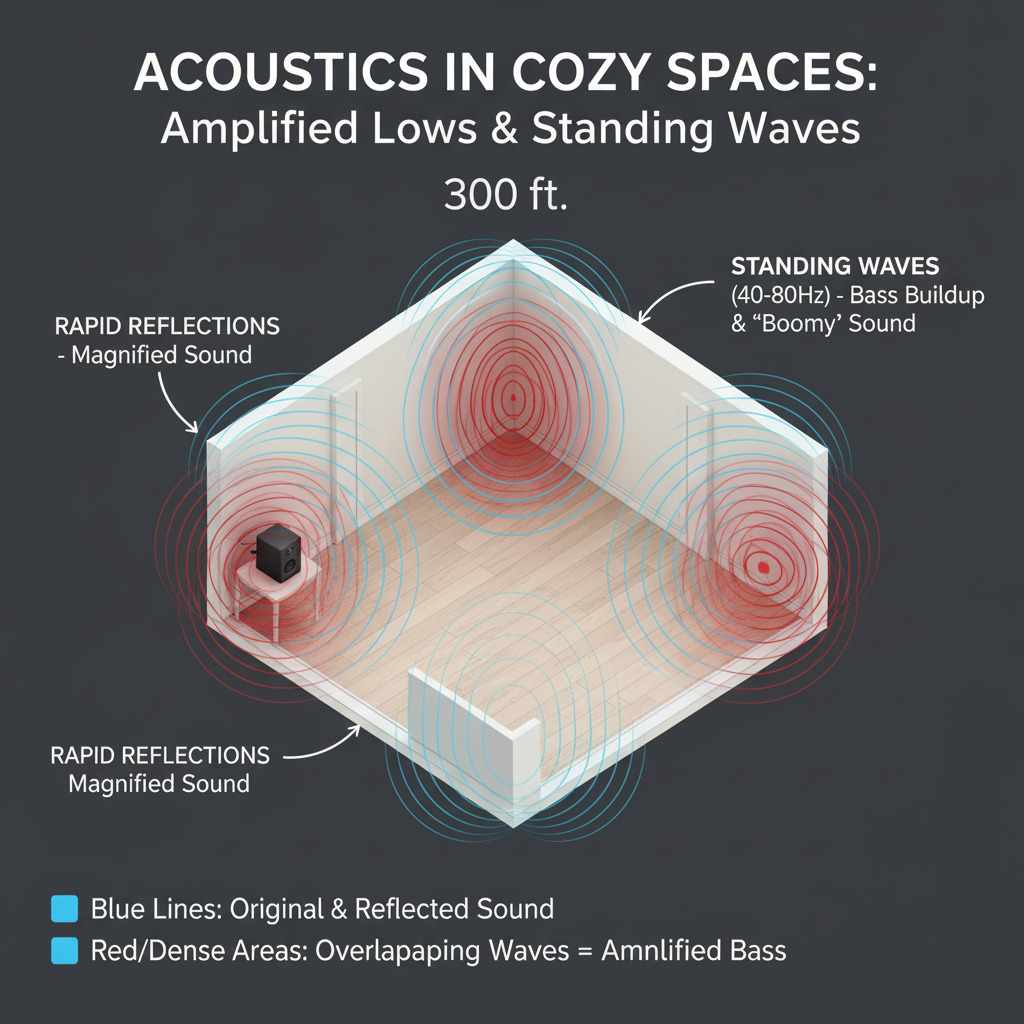 Compact living areas, often ≤500sqft, transform sound dynamics uniquely: Walls and furnishings reflect waves rapidly, magnifying bass buildup (standing waves at 40-80Hz) by up to 20dB, per 2025 acoustic studies, while thin barriers heighten leakage concerns. This creates "boomy" lows that dominate mids and a sensitivity where moderate volumes feel enveloping.