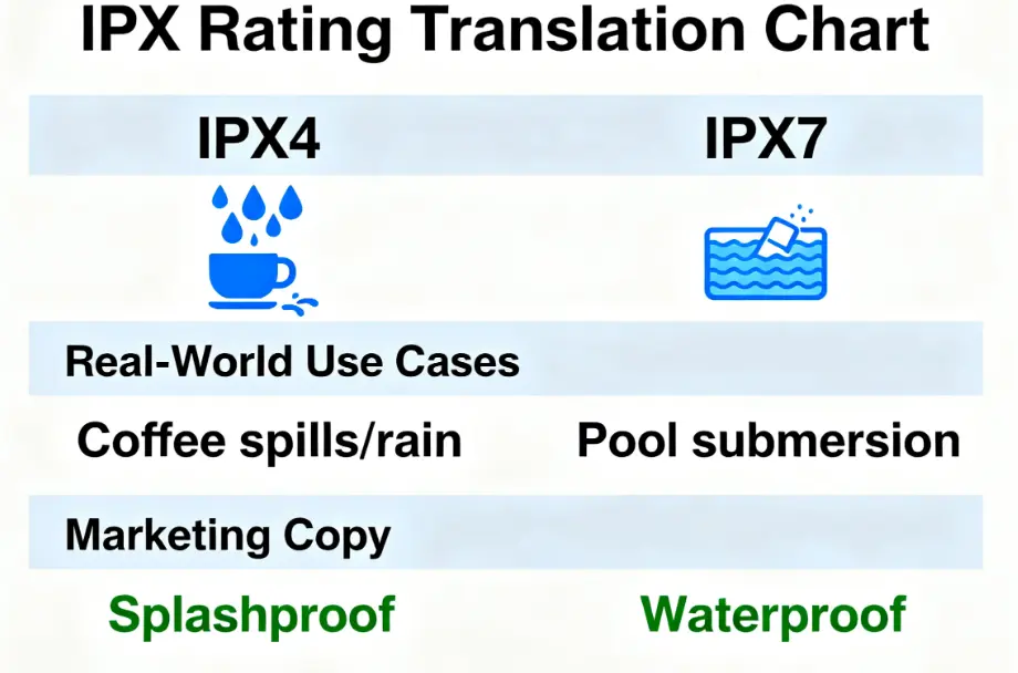 Customers don’t understand “IPX4”—they understand “safe from coffee spills” or “can be dropped in a pool.” Here’s how to translate ratings into marketing language (we use this for our clients):